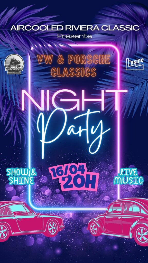 Nous vous invitons à venir partager un moment autour des VW et Porsche classiques, dans une ambiance Night Party unique, entre show & shine et live music.